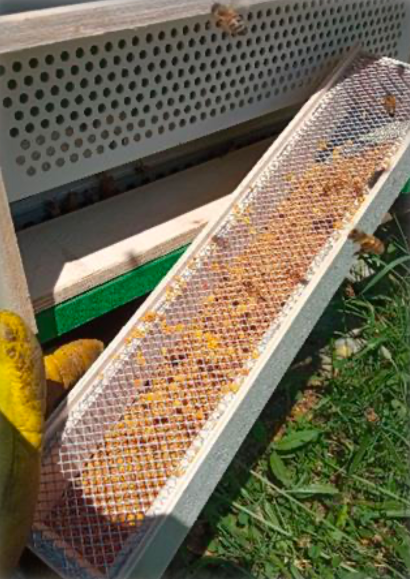 Quando in giugno inizia la fioritura del castagno, nel mio apiario sul monte di Provaglio d’Iseo, colloco davanti all’entrata dell’arnia delle trappole speciali che fanno cadere le palline di polline dalle zampe delle api.